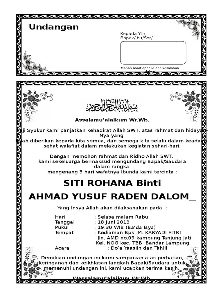 Yasinan dan tahlilan merupakan tradisi yang biasa dilakukan oleh masyarakat di indonesia. Semoga amal ibadah almarhumah diterima allah swt dan untuk keluarga yang ditinggalkan diberi ketabahan. Pertama sambutan dari mamah, ibu sri romadhiyati harmoko selaku sohibul hajat. Sambutan rektor warul walidin pada tahlilan (alm). Setelah itu kita akan melihat sedikit slide show video perjalanan .