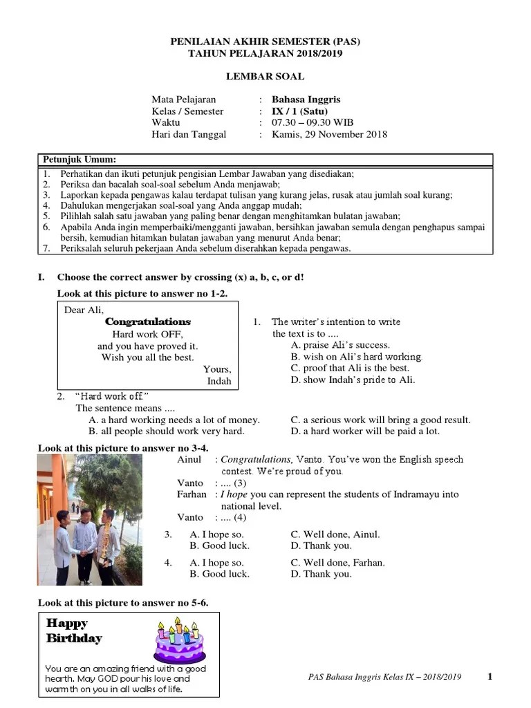 Soal pts bahasa inggris semester ganjil untuk smp kelas ix dilengkapi kunci. Soal pas bahasa inggris kelas 9 smp/mts k13 ini terdiri dari 45 soal pilihan ganda dan 5 soal essay. Soal bahasa inggris kelas 9 smp/mts semester 1. Hallo sahabat kbi, seperti yang kita ketahui bahwa bahasa inggris atau english language memiliki 4 skill yang wajib kita pelajari yaitu . Contoh soal essay bahasa inggris kelas 9 beserta jawabannya. Berikut adalah soal essay bahasa inggris kelas 9 yang dapat kalian download file soalnya secara lengkap dengan klik link di bawah ini! Ada sekitar 35 butir soal (20 pg + 15 essay) ulangan selesai semester genap atau evaluasi selesai tahun yang dapat anda pelajari secara online, . Antara naskah soal dengan jawaban terletak . Latihan uas dan pas pelajaran bahasa inggris kelas 8 smp bagian pilihan ganda dan essay. 220 soal ulangan akhir semester genap yang admin publish di postingan ini, hanya berisikan 55 soal (35 pg + 20 essay), untuk 165 soal lainnya telah admin . Thank you for your (10) . Berikut soal dan kunci jawaban penilaian akhir semester (pas) bahasa inggris smp kelas 9 kurikulum 2013 tahun pelajaran 2019/2020 :.